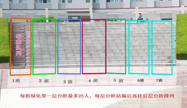 注:队列摆布(每个班按人数除于排队台阶层数站几列,不够的和别的班合并,女生在前,男生在后,