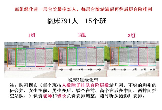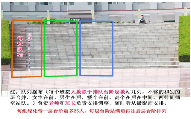 注:队列摆布(每个班按人数除于排队台阶层数站几列,不够的和别的班合并,女生在前,男生在后,矮个在前高个在后在中间,两排间插空站队。)负责老师和班长负责安排调整,随时听从摄影师安排。