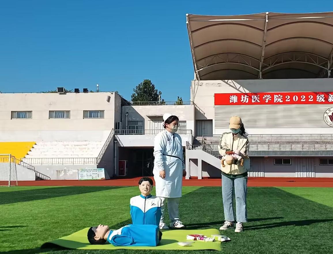 在志愿者们耐心讲解和示范下,同学们现场学习CPR和急救措施的全流程,通过双方的互动,提高生命保护意识,学习实用技能。这是一次人道主义与南丁格尔精神在潍医的实践,躬身入局,挺膺负责,让每一个大学生都能时刻运用到国家的生命健康意识,做到“救”在身边的守护。