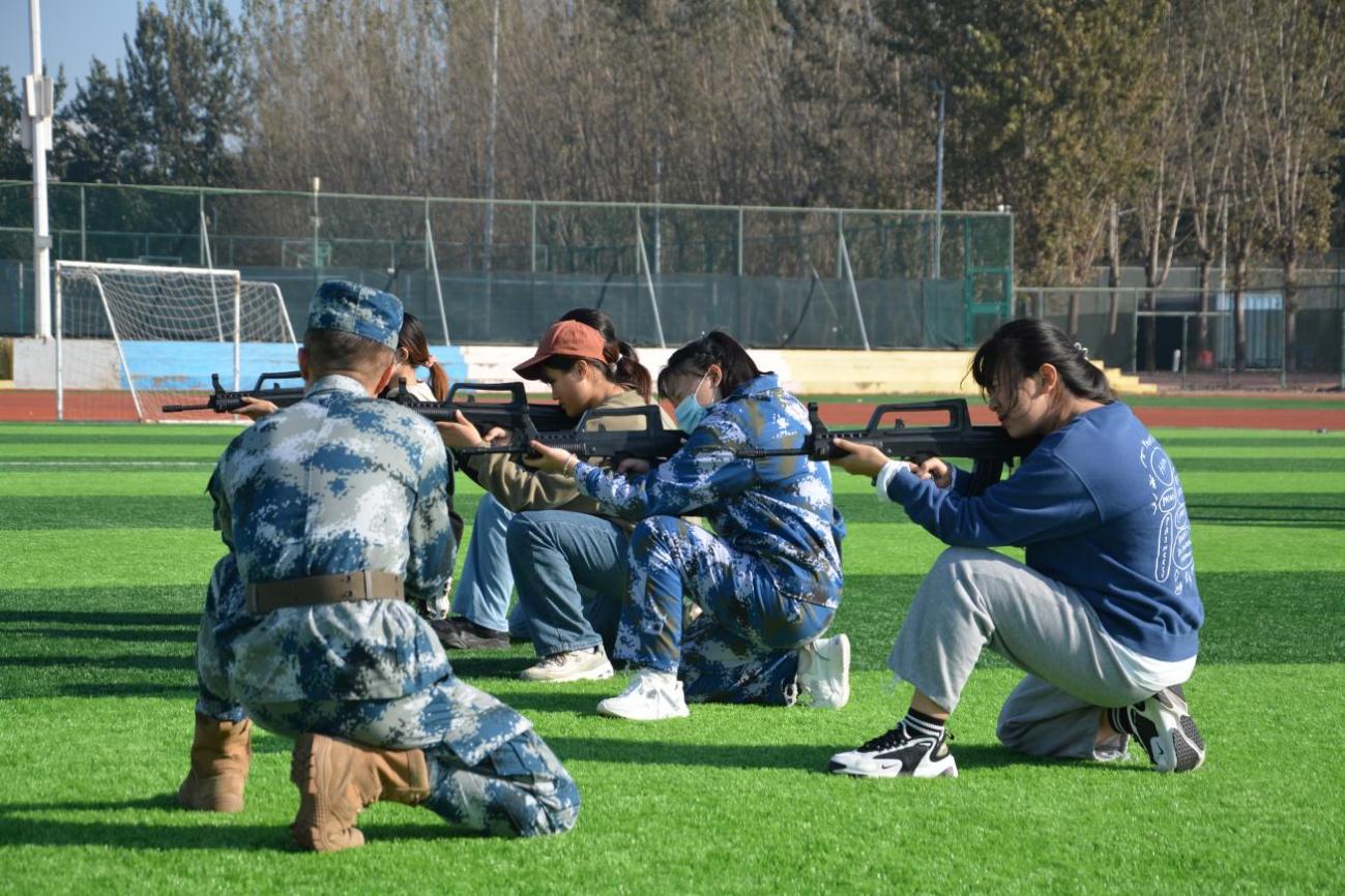 在体验据枪活动中,身在校园的同学们沉浸式体验战场,跟着退伍大学生学习据枪基本动作要领。立跪卧抵,三点一线。同学们扛起钢枪的同时也担起了保家卫国的责任,让青春的勇气展露于刺刀尖刃的锋芒。